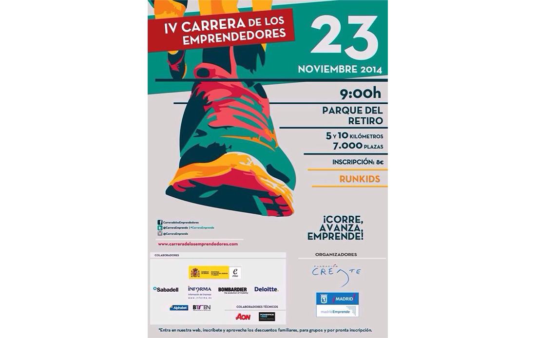 ¡Corre, avanza, emprende! es el lema de la Carrera de los Emprendedores, que saldrá del Retiro el próximo 23 de noviembre. El duro recorrido se convertirá para 7.000 corredores en un símbolo de las dificultades para salir adelante en medio de la crisis, pero también la prueba de que con esfuerzo y sin rendirse se pueden hacer realidad los sueños.